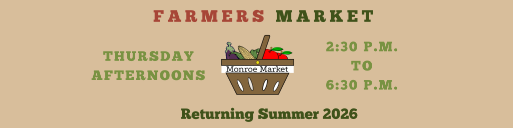 Summer will be here before you know it, and so will the 2026 Monroe Market! Our 5th season will once again feature fresh produce, baked goods, artisanal goods, live music, food trucks, and the Friends of the Library Book Sale!