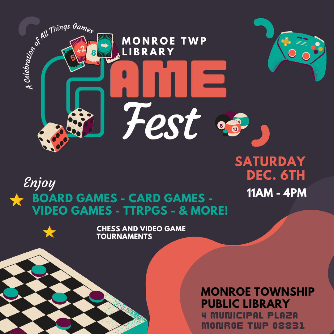 A celebration of all things gaming for all ages! GameFest will held on Saturday, December 6, 2025 from 11am to 4pm, featuring tabletop board games, Dungeons and Dragons, chess tournament, video game tournament, Pokémon, demos from game sellers, and more! There will be something for everyone. Bring your own board game to share or play one of the 60+ games in our circulating collection.