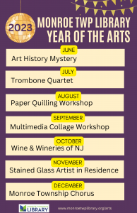The Monroe Township Library, in partnership with several community organizations, is kicking off The Year of the Arts campaign. In this yearlong effort to highlight arts-centric programming, we are offering a variety of events spanning all arts categories. Our library prides itself on being a hub of culture in the Township, and we invite patrons to join us here each month in celebration of all the arts has to offer.