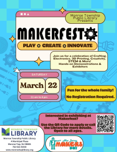 Makerfest is coming to the Monroe Township Public Library! On Saturday, March 22nd, the Library is holding its annual Makerfest event. Join us for a celebration of making, STEM and creativity. Exhibits will include 3D printing, robotics, engineering challenges, stained glass, green screen photography, and much more. There will be hands-on demonstrations and projects you can make. Makerfest is being held on NJ Makers Day; the statewide initiative to promote and grow maker culture.