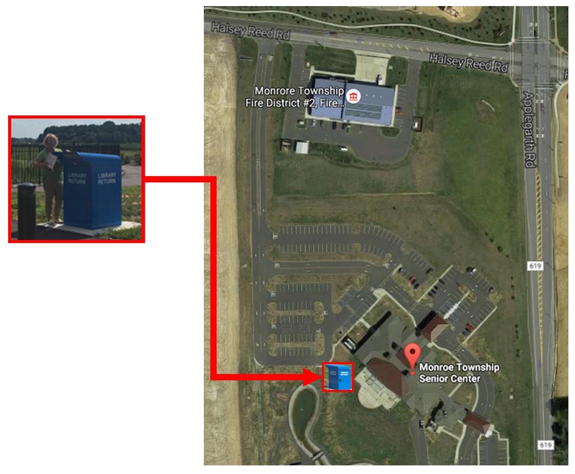 The Monroe Township Library has placed a book return at the Senior Center on Halsey Reed Road. You can return your books at this walk-up book return located on the west side of the building.
