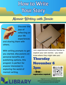 On Thursday, November 6, 2025 at 3:00 p.m., discover the joys of reflecting on your life experiences and sharing them with others. With writing prompts to get you started, discussions on personal benefits and publishing options, this program is perfect for anyone interested in exploring the world of memoir writing. Join experienced instructor Denise to explore your own stories – you never know where they might take you!