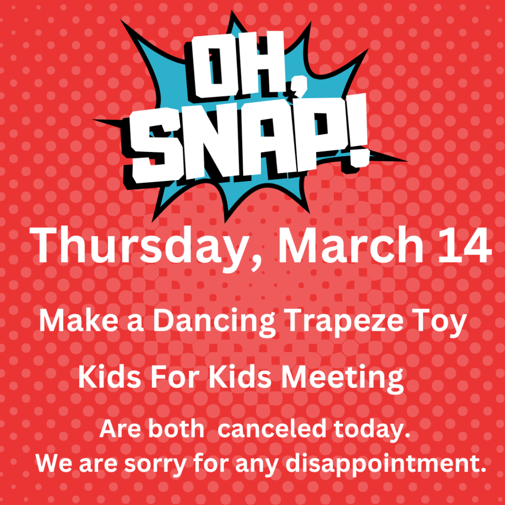 Both Make a Dancing Trapeze Toy and the Kids for Kids meeting scheduled for this evening, March 14, 2024 have been canceled. We are sorry for any disappointment.