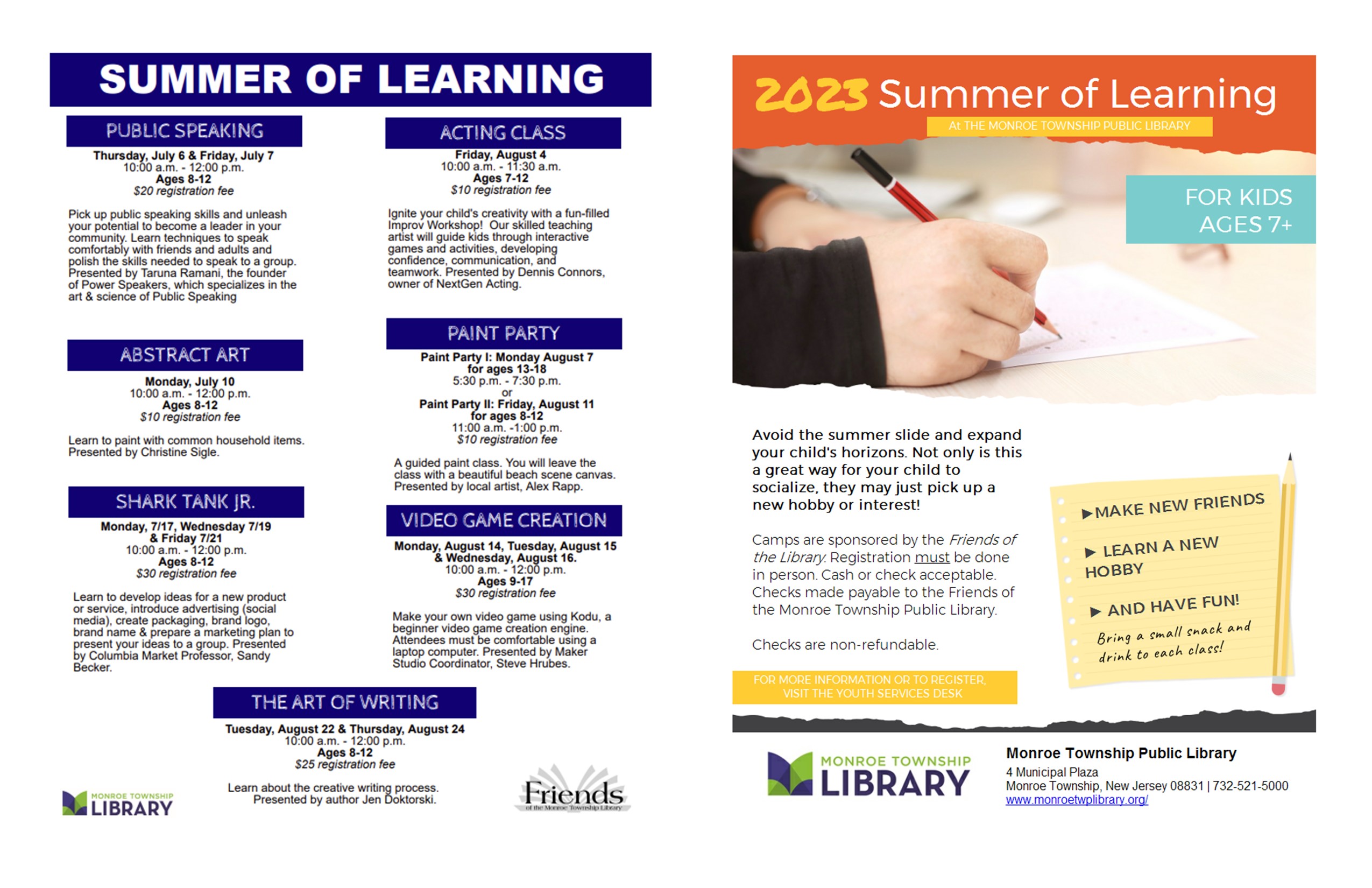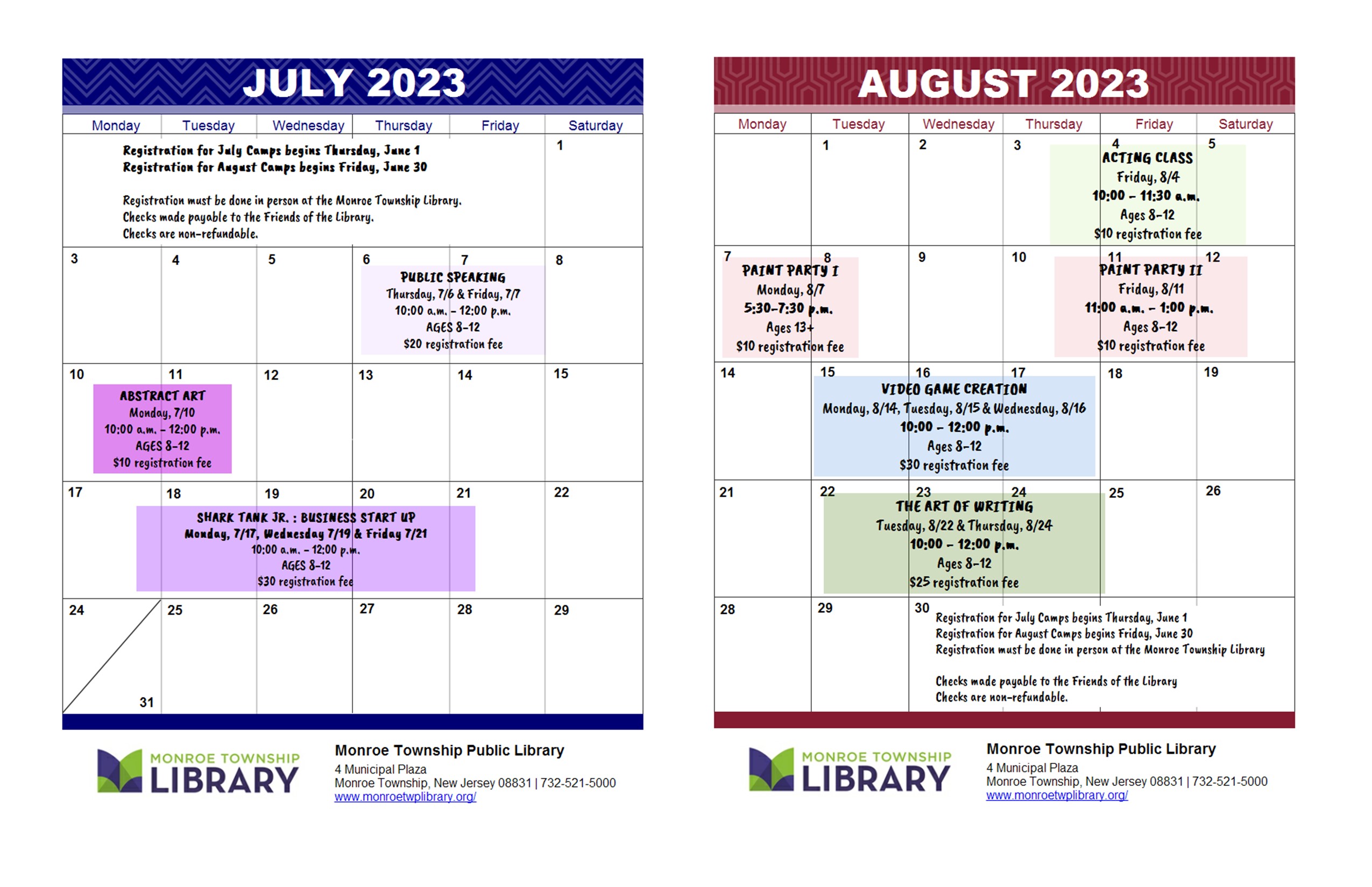 Registration must be done in person. Cash or checks payable to the Friends of the Monroe Township Public Library.